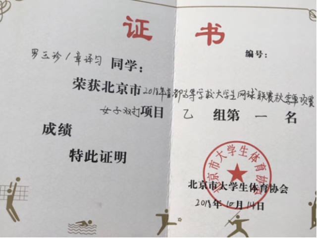 2018年首都高等学校大学生网球联赛秋季单项赛于2018年10月13至21日,在北京化工大学、中国人民大学、中央民族大学、国际关系学院同时开赛。冰球官网普通学生网球队在体育部王力老师带领下参赛,经过近半月赛场激烈角逐,取得女双乙组冠军、女单乙组第五名优异成绩,创造冰球官网普通学生网球队同类赛事参赛最好成绩。
