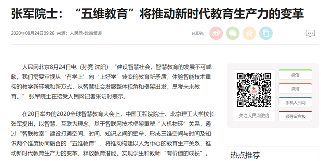 “建设智慧社会,智慧教育的发展不可或缺。我们需要审视从‘有学上’向‘上好学’转变的教育新矛盾,体验智能技术重构的教学新环境和新方式,从智慧社会发展整体视角和框架出发,思考未来教育。” 张军院士在接受人民网记者采访时表示。