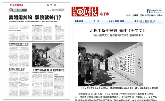 据记者在现场了解,大部分新生都按照学习要求在假期学习了这两篇古文。但由于没有老师的辅导,只能通过网络辅助学习,因此对于文章大意的理解不是很准确,目前只能做到通篇诵读,希望有老师可以辅导一下。