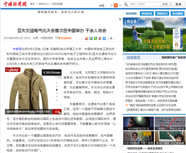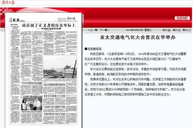 科技日报讯 (记者吴佳珅)9月1日, 2014年度IEEE亚太交通电气化大会暨展览会在京召开。本次大会是电气电子工程师协会在亚太地区首次以“交通电气化”为主题的会议,这也是此类大会首次在华举办。
