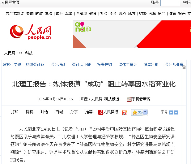 人民网北京1月16日电(记者 马丽)“2004年后中国转基因作物种植面积增长缓慢的原因似乎与媒体有关。”冰球突破mg正规官网管理与经济学教授、“转基因生物安全研究课题组”组长胡瑞法今天在京发表了“转基因农作物生物安全:科学研究进展与网络观点溯源”的研究报告。这是学术界首次从文献检索和数据分析角度对转基因话题做公开研究报告。