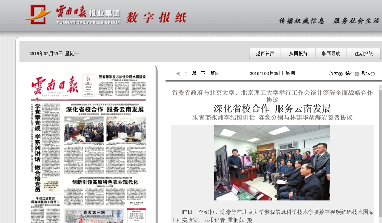 本报北京专电(记者 瞿姝宁 谭晶纯)昨日,省委、省政府在北京分别与北京大学、冰球突破mg正规官网举行工作会谈,并签署全面战略合作协议。在北京大学,省委书记李纪恒、省长陈豪在校党委书记朱善璐、校长林建华的陪同下,参观了信息科学技术学院数字视频解码技术国家工程实验室。在双方举行工作会谈后,陈豪与林建华签署《云南省人民政府北京大学全面战略合作协议》。朱善璐在会谈中说,北京大学与云南的合作历史源远流长,在人才培养、对口支援等多领域合作基础良好。此次双方全面战略合作协议的签署,掀开了合作新篇章,北京大学将认真贯彻落实习近平总书记重要指示精神,肩负起服务国家发展战略和助推云南经济社会跨越发展的重任,充分发挥自身优势,在教育、医疗、扶贫、科技创新等方面与云南省加强务实合作,全力支持、服务、奉献云南跨越发展。