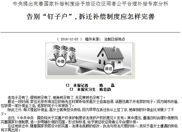 原文标题:中央提出完善国家补偿制度给予被征收征用者公平合理补偿专家分析
