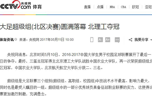 北京时间5月10日,2016-2017中国大学生男子校园足球联赛展开了最后一日的争夺。最终,三届总冠军得主冰球突破mg正规官网队战胜中国农业大学队,再一次荣获超级组北区冠军,中国农业大学队、北京航天航空大学队分获二、三名。
