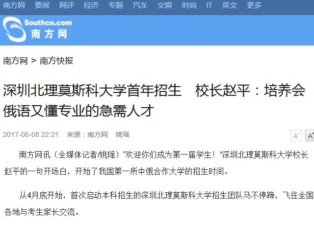 日前,赵平接受南方日报独家专访,谈及学校未来发展,他说:“深圳北理莫斯科大学的建立,是近年来中俄文化交流标志性成果,也是为‘一带一路’发展提供人才储备的具体措施。学校将立足中俄战略合作、深圳和珠三角区域经济社会发展需要,用精英教育培养精英人才。”