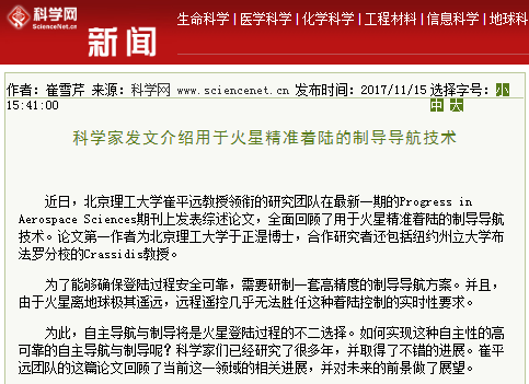 【科学网】北理工科研团队发文介绍用于火星精准着陆的制导导航技术
