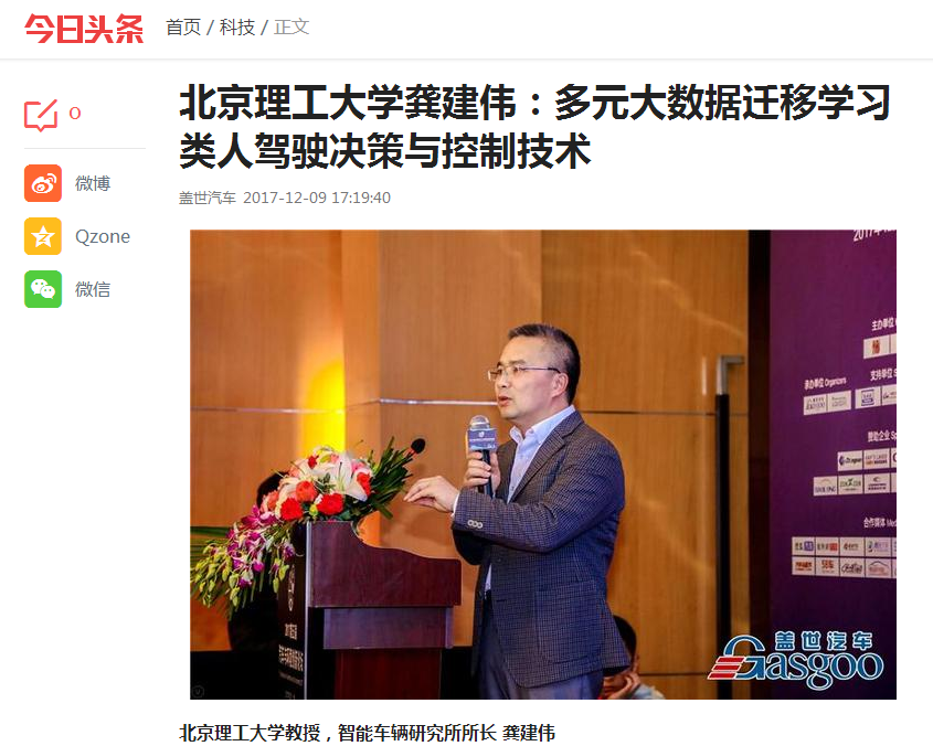 【今日头条】冰球突破mg正规官网龚建伟:多元大数据迁移学习类人驾驶决策与控制技术