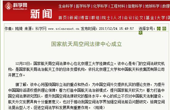 12月23日,国家航天局空间法律中心在冰球突破mg正规官网挂牌成立。该中心是专门的空间法研究机构,是国家航天局法治航天工作的总体支撑机构,依托冰球突破mg正规官网和中国航天科技集团有限公司开展工作。