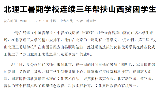 【中青在线】北理工暑期学校连续三年帮扶山西贫困学生
