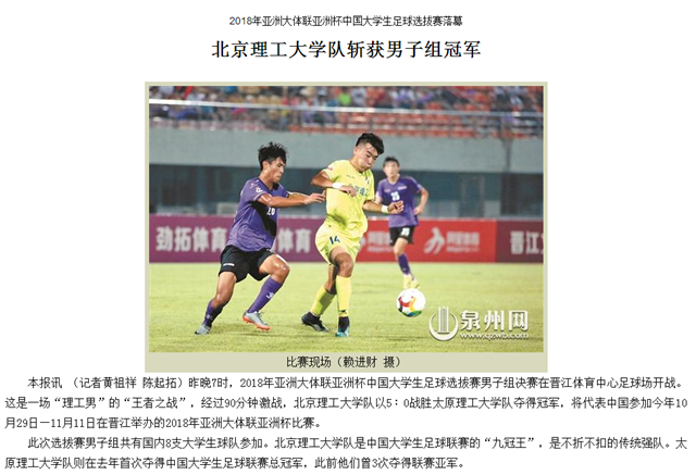 【泉州晚报】冰球突破mg正规官网队斩获2018年亚洲大体联亚洲杯中国大学生足球选拔赛男子组冠军