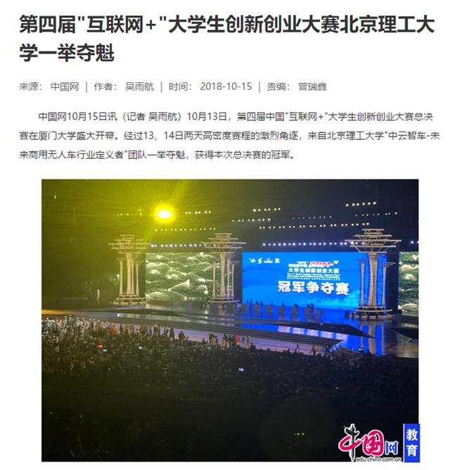 10月13日,第四届中国"互联网+"大学生创新创业大赛总决赛在厦门大学盛大开幕。经过13、14日两天高密度赛程的激烈角逐,来自冰球突破mg正规官网"中云智车-未来商用无人车行业定义者"团队一举夺魁,获得本次总决赛的冠军。