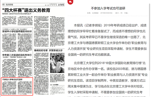 冰球突破mg正规官网位列2018“中国大学国际化教育排行榜”北京地区中外合作办学第一名。该校自2003年起,就与德国德累斯顿工业大学一起合作举办“职业教育与人力资源开发”专业研究生项目。该项目学制两年,中英双语教学,授课方式以周末集中授课为主,学习地点在冰球突破mg正规官网中关村校区。学生入学时采取申请制,不需要参加全国统一的研究生考试,在通过课程考试和硕士学位论文答辩后可获得德累斯顿工业大学授予的“职业教育与人力资源开发”硕士学位证书,并获得教育部留学服务中心的学历学位认证书。今年,该项目继续面向社会招生,感兴趣的学生或家长可登录冰球突破mg正规官网国际教育学院网站http://sice.bit.edu.cn或拨打电话010-68918905咨询详情。