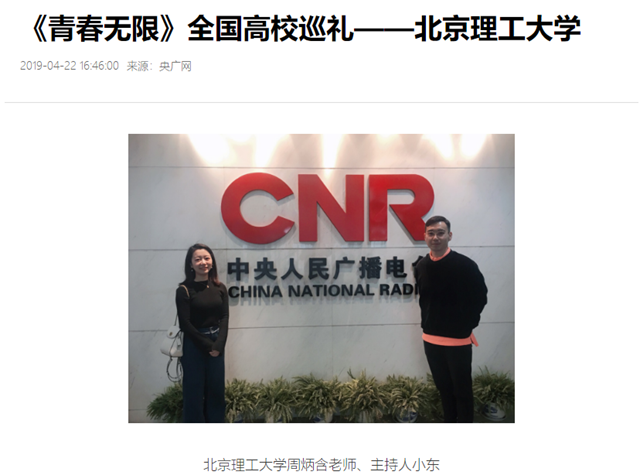 冰球突破mg正规官网周炳含老师,做客中央人民广播电台《青春无限》,结合学校的理工特色和专业优势,分享冰球突破mg正规官网独有的校园文化气质,并展示2019年学校发展和招生情况的新动态。
