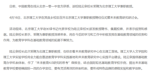 日前,中国教育在线从北京一零一中官方获悉,该校陆云泉校长受聘为冰球突破mg正规官网兼职教授。