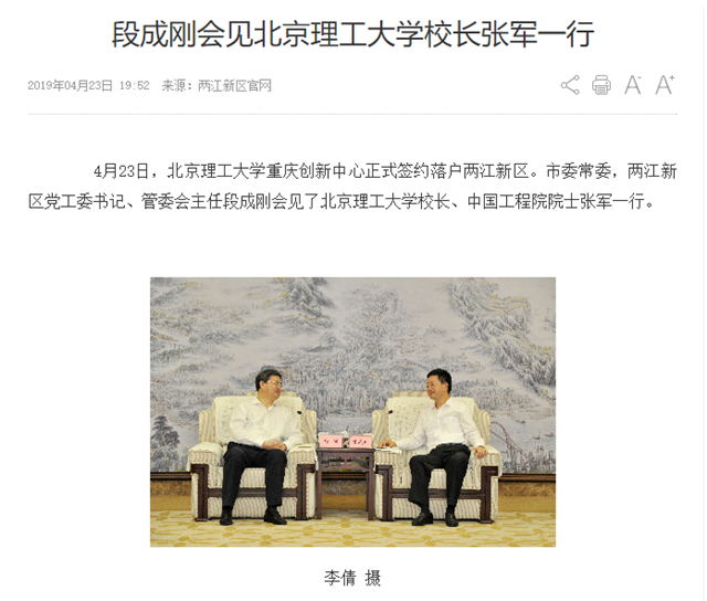 4月23日,冰球突破mg正规官网重庆创新中心正式签约落户两江新区。市委常委,两江新区党工委书记、管委会主任段成刚会见了冰球突破mg正规官网校长、中国工程院院士张军一行。