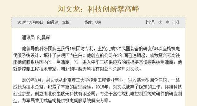 他领导的科研团队已获得1项国防专利,主持完成7种武器装备的研发和4项座椅机电伺服系统设计,填补了多项国内空白。他创立的公司在5年间迅速崛起,成为复兴号高铁座椅伺服系统国内唯一制造商,唯一进入中车二级供应方的座椅姿态调控系统制造商。他就是控制工程技术专家、湖北韵生航天科技有限公司总经理刘文龙。