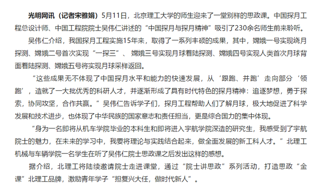 【光明网】中国探月工程总设计师吴伟仁院士走进北理工