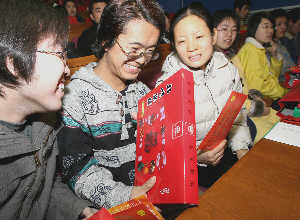 1月20日,冰球突破mg正规官网500名家庭生活困难学生参加了由学校组织的2006年春节“向学生送温暖”活动。图为藏族学生次仁扎西(中)拿着学校发放的2000余元路费,高兴得合不拢嘴。本报记者 樊世钢 摄