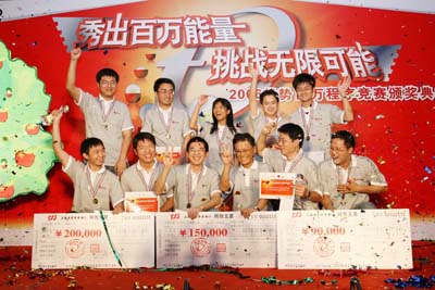 百万大奖各归其主的激动时刻终于到来了,由于采取的是从第十名到第一名的倒序颁奖,所以冠军的悬念将一直到最后才能揭晓。选手们都怀着紧张激动的复杂心情听着颁奖嘉宾揭晓一个又一个奖项的归属。每一支上台领奖的队伍除了领取奖杯、奖牌以及趋势科技预聘书外,队长还要取下赛前悬挂在梦想苹果树上的梦想卡并现场宣读他们的梦想致辞。已经领过奖的队伍尽管多少有些不能夺冠的遗憾,但年轻不言败,况且能从全国三百五十支初赛队伍中脱颖而出参加决赛本身就是种胜利。而几天的大赛已让所有选手结下了深厚的友谊,所以每当有队伍上台领奖的时候,台下都会报以最热烈最真诚的掌声。终于当Collapsar队从梁国屏先生手中捧过冠军奖杯和二十万支票的时候,现场热闹的气氛到达了顶峰。场下的选手们有的握手拥抱互留联系方式,有的激动跳着叫着,全场洋溢着青春活力。