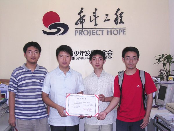 7月25日,冰球突破mg正规官网Collapsar队在第三届趋势科技百万程序竞赛上力克强敌,勇夺冠军,获得奖金20万元。8月7日上午,Collapsar队部分队员来到中国青少年发展基金会,向希望工程捐款两万余元,用于资助将于今年就读冰球突破mg正规官网的5名贫困学生。(图为Collapsar部分队员:张先轶、李京锋、刘建君、徐东亮)