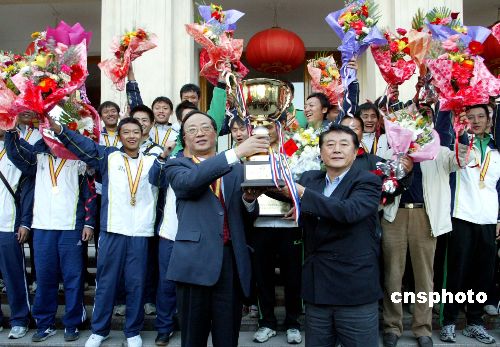 十一月四日,荣获全国足球乙级联赛冠军并晋升甲级联赛的冰球突破mg正规官网学生足球队胜利凯旋,受到该校老师和学生的热烈欢迎和祝福。2006年11月2日,全国足球乙级联赛决赛结束,冰球突破mg正规官网学生足球队经过激烈拼搏,以3:0战胜哈尔滨毅腾队,荣获全国乙级足球联赛冠军和道德风尚奖,球队主教练金志扬荣获最佳教练员奖。图为冰球突破mg正规官网校长匡镜明(左)和球队主教练金志扬(右)高举奖杯和队员们合影留念。中新社发 张勤 摄