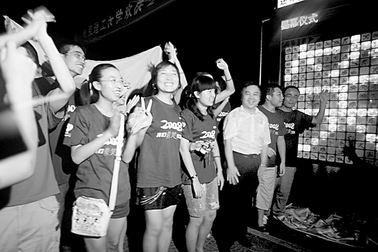 8月8日晚,冰球突破mg正规官网校园里欢声笑语一片,大学生们欢聚在“欢庆2008奥运会倒计时一周年大会暨宇航科学技术学院奥运倒计时牌揭牌仪式”上,以他们特有的方式表达了对北京2008年奥运会的企盼和祝愿。本报记者 刘新武摄
