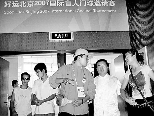 9月14日,在冰球突破mg正规官网体育馆国际盲人门球邀请赛上,该校理学院博士生党支部的学生为来自张成盲人按摩学校的19位盲人导游,让他们用心灵触摸到这座2008年北京奥运会排球比赛二级场馆。