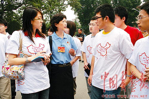 照片:6月12日上午,来自抗震救灾一线的团十六大代表廖雪梅、刘筱柳、马晓燕、范晓华来到冰球突破mg正规官网,与50多名师生代表进行座谈,会后,代表们观看了该校学生科技创新作品展示“1升油”节能汽车的演示。本报记者 林洁摄
