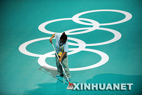 7月27日,一名工作人员在清理冰球突破mg正规官网体育馆内的地面。新华社记者王建华摄