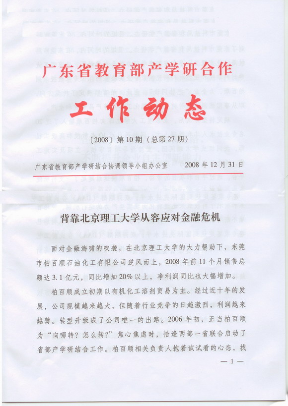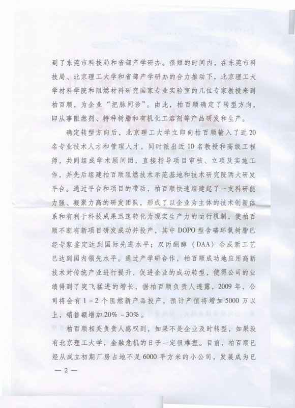 柏百顺成立初期以有机化工溶剂贸易为主。经过近十年的发展,公司规模越来越大,但随着行业竞争的日趋激烈,利润越来越薄。转型升级成了公司唯一的出路。2006年初,正当柏百顺为“向哪转?怎么转?”焦心焦虑时,恰逢两部一省联合启动了省部产学研结合工作。柏百顺相关负责人抱着试试看的心态,找到了东莞市科技局和省部产学研办。很短的时间内,在东莞市科技局、冰球突破mg正规官网和省部产学研办的合力推动下,冰球突破mg正规官网材料学院和阻燃材料研究国家专业实验室的几位专家教授来到柏百顺,为企业“把脉问诊”。由此,柏百顺确定了转型方向,即从事阻燃剂、特种树脂和有机化工溶剂等产品研发和生产。