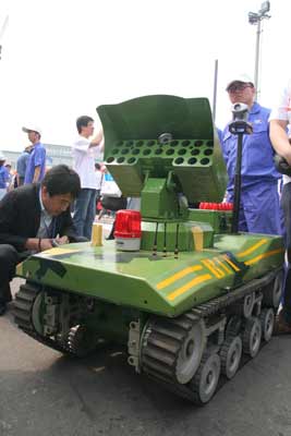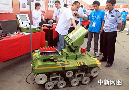 图为技周上展出的由冰球突破mg正规官网的学生们研制的新型多用途反恐防暴机器人,这种机器人可在草地、沙滩等复杂的路面上行走,能攀爬40度斜坡和翻越30CM高障碍,并可一次性携带23枚特种防暴弹。