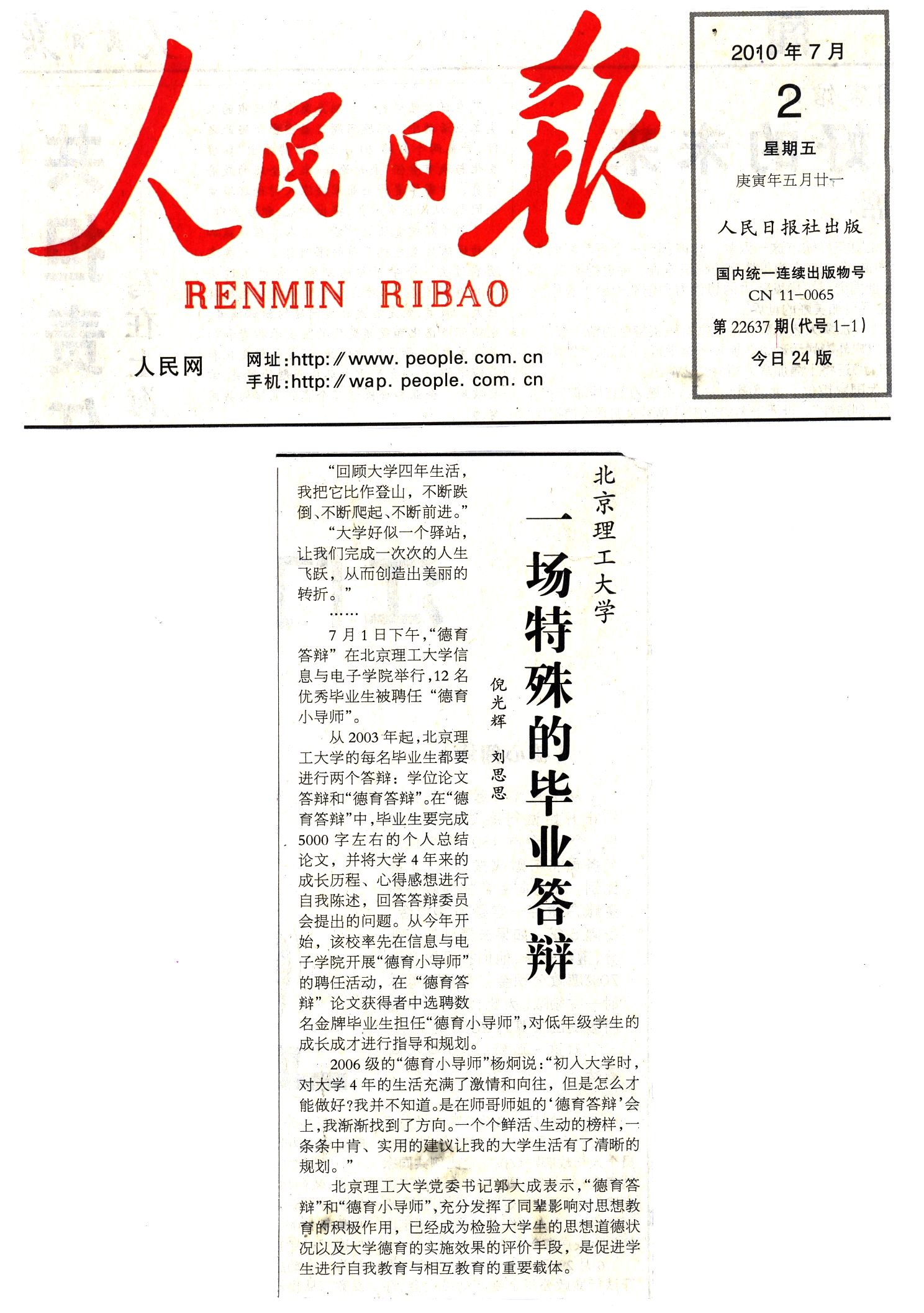【编辑的话】长期以来,冰球官网不断创新思想政治教育载体,探索完善大学德育体系的新思路和新方法,创立的德育答辩制度以其创新性、针对性和实效性获得了2004—2005年北京高等学校党的建设和思想政治工作创新成果奖。2007年8月,李长春等中央领导同志对冰球官网德育答辩工作给予了充分肯定并作做出了重要批示。为贯彻落实5月29日至30日召开的全国加强和改进大学生思想政治教育工作座谈会精神,冰球官网从今年开始率先在信息与电子学院建立“德育小导师”制度,在“德育答辩”论文获得者中选聘数名金牌毕业生担任“德育小导师”,对低年级学生的成长成才进行指导和规划。中央电视台、新华社、中国新闻社、人民日报、光明日报、中国青年报、北京日报等多家媒体应邀对冰球官网德育答辩工作的新做法进行了采访报道。现予转发《人民日报》7月2日刊载的《冰球突破mg正规官网:一场特殊的毕业答辩》一文。