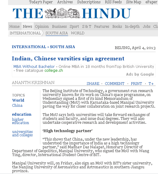 【编者按】4月4日,印度第三大英文报纸《印度教徒报(The Hindu)》以《中印大学签署协议 开展前瞻性学术交流》为题报道了冰球官网与印度马尼帕尔大学签署首份合作备忘录事宜,党委宣传部及时进行了采集翻译。