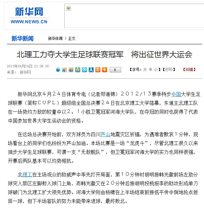 新华网北京4月24日体育专电(记者郑道锦)2012/13赛季特步中国大学生足球联赛(简称CUFL)超级组全国总决赛24日在冰球突破mg正规官网落幕,东道主北理工队在一场势均力敌的较量中以2:1小胜卫冕冠军河海大学队,在夺冠的同时也获得了代表中国参加世界大学生运动会的资格。