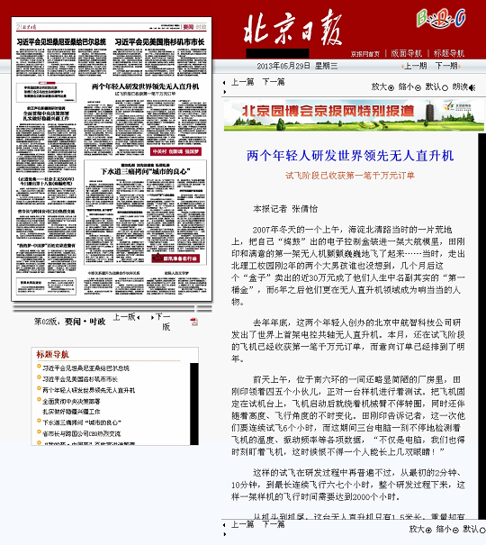 去年年底,这两个年轻人创办的北京中航智科技公司研发出了世界上首架电控共轴无人直升机。本月,还在试飞阶段的飞机已经收获第一笔千万元订单,而意向订单已经排到了明年。