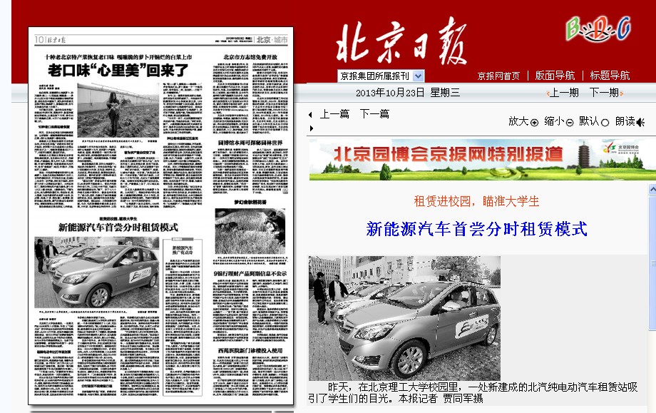 【北京日报】租赁进校园,瞄准大学生——新能源汽车首尝分时租赁模式