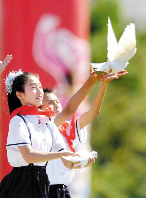 6万羽和平鸽放飞蓝天,彩色气球腾空而起,少年儿童们涌向金水桥。党和国家领导人面带笑容,向少年儿童们致意。在全场齐唱《歌唱祖国》的高潮中,群众游行活动结束。 (据新华社电)