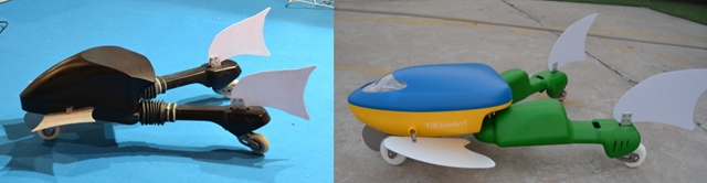 (黑色的是第一代两栖蛙板机器人;花色的是第二代两栖蛙板机器人。)