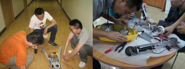 两栖蛙板机器人的制作过程充满了艰辛。在两代两栖机器人的制作以及调试过程中,团队成员遇到了很多困难:机械干涉问题、外壳难以安装、电机老化极其损坏、烧坏电路板、程序调试难题、信号干扰……;同时机械零件的绘制、外壳模型的建立与绘制、机器人的整体安装、加工厂的寻找、合同的签订、方案的制定……每一个过程都需要团队成员们亲力亲为。在这期间,团队成员夜以继日的奋斗在实验室,不顾课业繁重辛苦,不顾偌大的校园东西奔波,他们住在一起,学在一起,讨论在一起,一有时间就学习、讨论,时间的积累,沉淀的不仅是厚厚的知识更是浓浓的友情。在指导老师的指导与要求下,团队成员一步步完善机器人的性能以及内部结构,用实际行动和100%的精力去实现自己的挑战杯之梦。