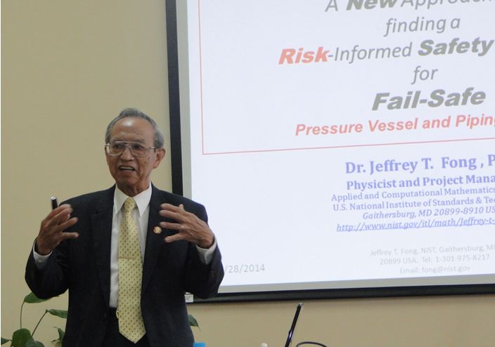 2014年8月29日,应机械与车辆学院徐春广教授邀请,美国国家科技标准研究院资深学者、美国费城德雷塞尔与加州斯坦福两所大学客座教授、美籍华人方资慧博士来冰球官网先进加工技术重点学科实验室进行访问交流。访问期间,方博士参观了机械与车辆学院的检测与控制研究所,并为师生作了题为“A New Approach to finding a Risk-informed Safety Factor for Fail-Safe Pressure Vessel and Piping Design”的学术报告。方博士通过介绍“应用数学”、“应用物理”、“应用物理”三门科技理论,阐述“无损探伤数量工艺技术学”的内涵。同时,方博士还为我们展示了统计分析软件以及如何应用现代统计学结合统计分析软件进行实验设计。方博士的语言诙谐、幽默、生动,报告的内容引起与会师生的浓厚兴趣,展开了热烈的讨论。