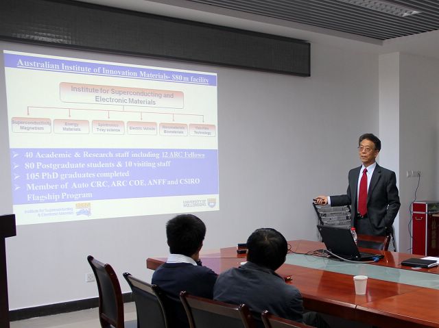 2014年10月13日,应冰球突破mg正规官网材料学院张加涛教授的邀请,两位澳大利亚工程科学院院士,澳大利亚伍伦贡 (Wollongong)大学超导与电子材料研究所(ISEM)所长窦世学教授,刘化鹍教授来冰球官网访问,窦世学教授为北理工师生带来题为“Development of Nano-materials for Energy Applications at ISEM”的精彩学术报告。报告会由张加涛教授主持,材料学院曹传宝教授、钟海政教授、化工与环境学院陈人杰教授等出席报告会。