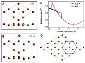 图2 A、B, 1x1(AB)的硅烯和√3x√3超结构(AB-A)的俯视图和侧视图。注意在√3x√3超结构的(2/3,2/3)的硅向下起伏。红色、黄色和绿色分别代表A位、B位和-A位。C, 1x1(AB)的硅烯和√3x√3超结构(AB-A)的结构相图。 D,大范围的√3x√3超结构。