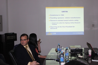 在学术交流中,James R. Sayer 对密歇根大学的研究历史以及他所在的交通运输研究所的研究内容做介绍;Dr. Jim Sayer介绍了他作为主任的人因工程研究中心的在研课题,主要包括交通事故的统计分析、Integrated Vehicle-Based Safety Systems (IVBSS) 和The Connected Vehicle Safety Pilot Program等,视频演示了在行车过程中不同因素对于行车安全的影响。