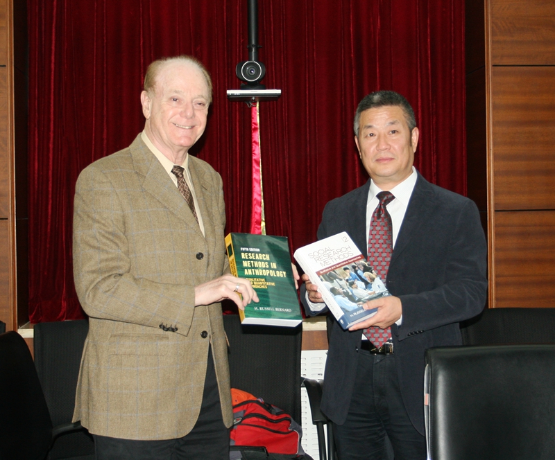 2013年11月6日,美国科学院院士H.Russell Bernard教授访问冰球突破mg正规官网。赵长禄副校长在办公楼亲切接见了Bernard教授及夫人一行。赵长禄副校长高度肯定了Bernard教授在人类学、社会科学研究方法等领域的卓越贡献,介绍了冰球官网人文社会科学发展、科学研究与人才培养情况,尤其是近年来促进自然科学与社会科学融合、鼓励支持交叉学科发展的部分举措。Bernard教授感谢冰球官网提供的宝贵的学术交流机会,他指出,自然科学与社会科学都是科学,不应人为将二者割裂开来,学校发展应给予社会科学高度重视。赵长禄副校长与Bernard教授还围绕合作开展学术研究、学科建设、课程开发、研究成果翻译等内容进行了友好会谈。