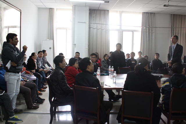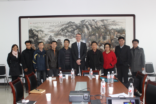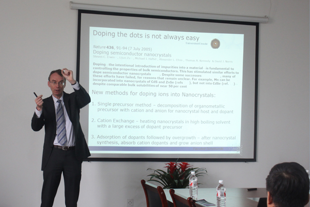 学术报告由邹炳锁教授主持,材料学院金海波副院长、张加涛教授、佟斌教授、石建兵老师、高丽红老师,物理学院杨盛谊教授,化学学院张晓玲教授以及中国地质大学夏志国副教授参加了此次学术报告,并就各自关心的学术问题与Meijerink教授进行了热烈讨论。学术报告之后,Meijerink教授参观了纳米光子学实验室,钟海政教授向他详细介绍了实验室的仪器设备和近期进展情况,Meijerink教授肯定了我们在纳米线和纳米晶发光研究方面的进展,并就有关方面的合作和人才培养等问题进行了探讨。