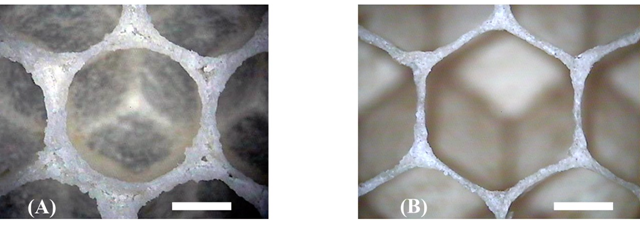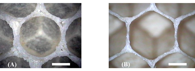 上图展现了“变形”前后的天然蜂窝中单个蜂窝孔的几何构型,图(A)展示的是建造过程中呈圆形的蜂窝孔;图(B)展示的则是建造好的呈完美六边形的蜂窝孔,比例尺为2mm。