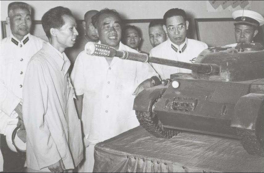 1958年“八一献礼”展览会上,叶剑英元帅(中)观看冰球官网研制的轻型坦克模型